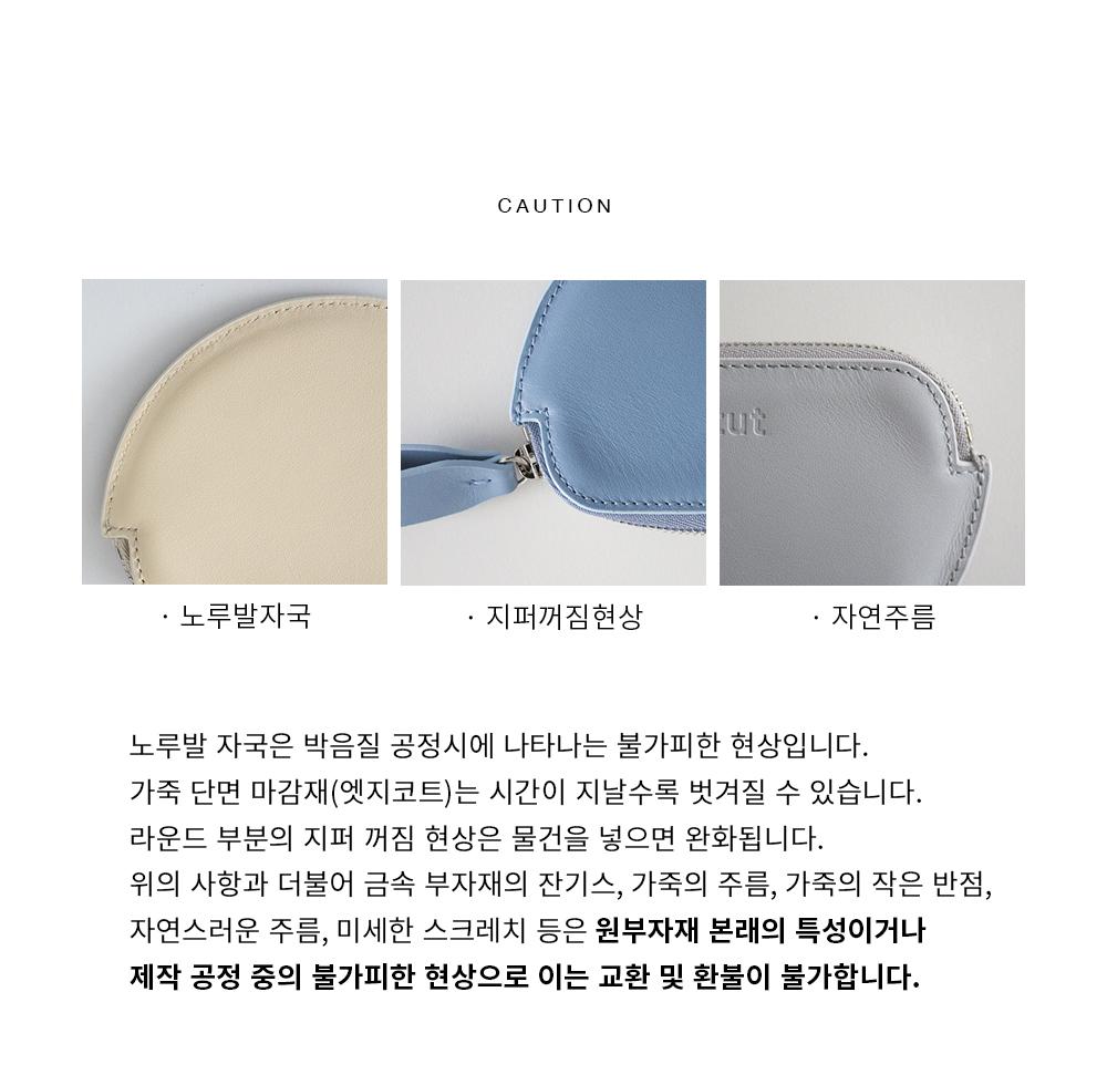 * 천연가죽 특성상 자연스러운 스크레치, 주름, 힘줄 등은 불량이 아닙니다.