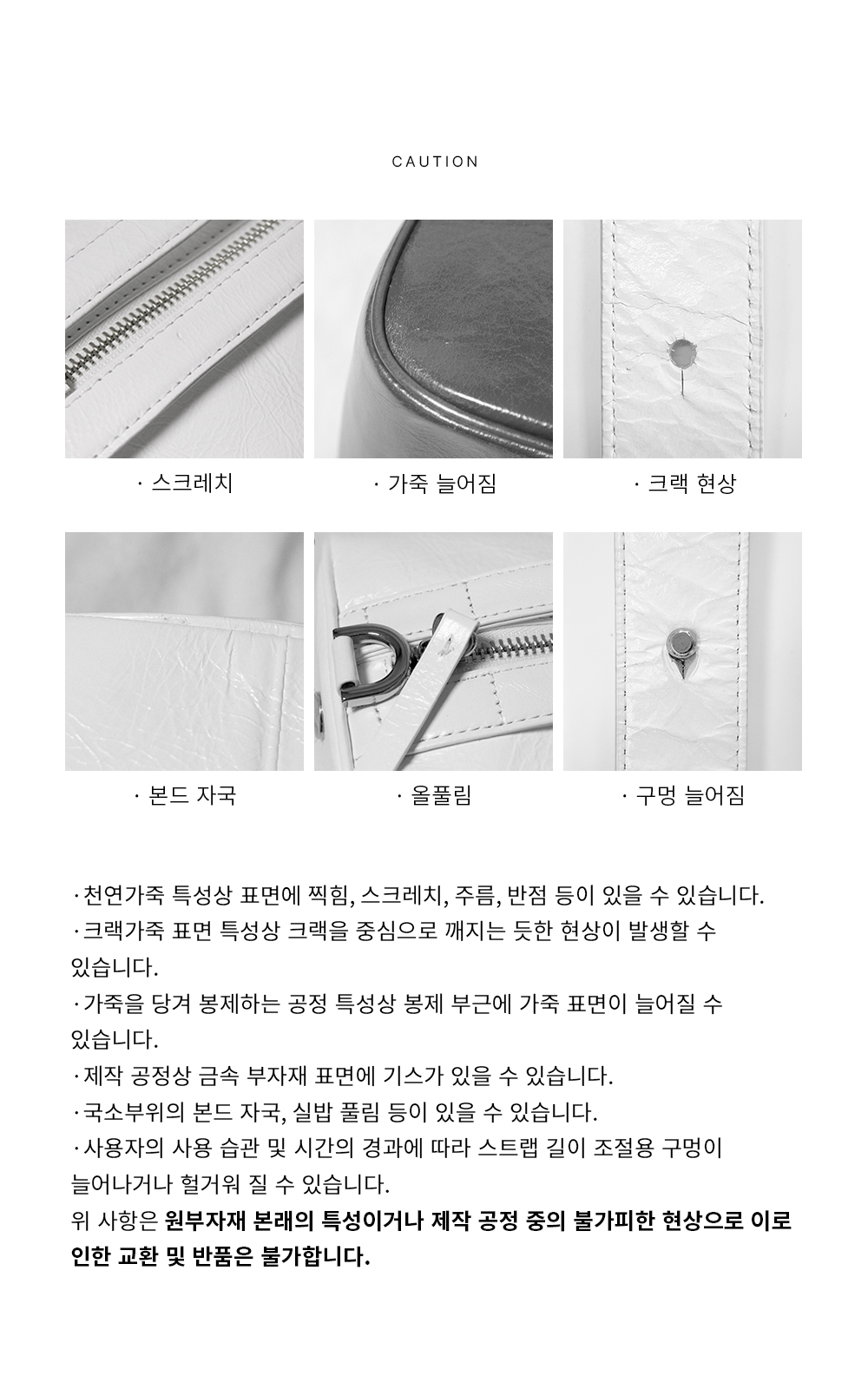 *CRACK WHITE/GRAY는 가죽 색상 특성상 음식물 및 음료, 색조 화장품, 색 고정력이 불안정한 컬러 의류 등에 의한 이염 및 오염에 주의해주시기 바랍니다.